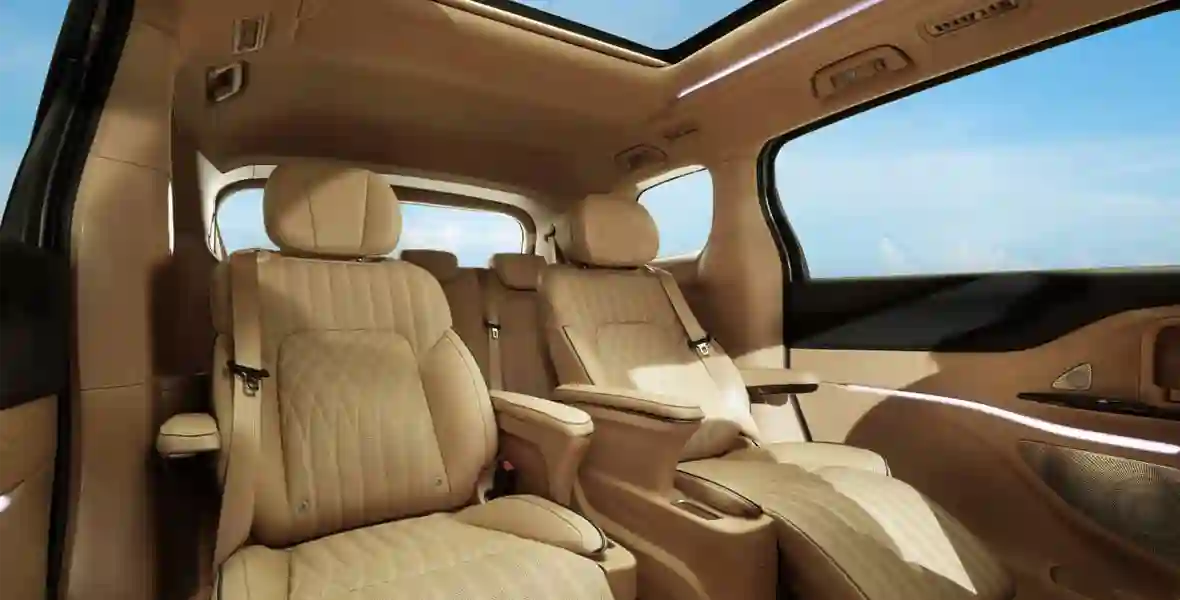 Просторный салон бизнес-класса с раздельными креслами второго ряда, оснащенными подогревом, вентиляцией, массажем, электрорегулировками и подставками для ног, превращает минивэн в настоящий офис на колесах, где можно спокойно поработать или отдохнуть в дороге. Сдвижные двери с электроприводом обеспечивают удобную посадку, а отдельная зона климат-контроля позволяет настроить температуру под себя.